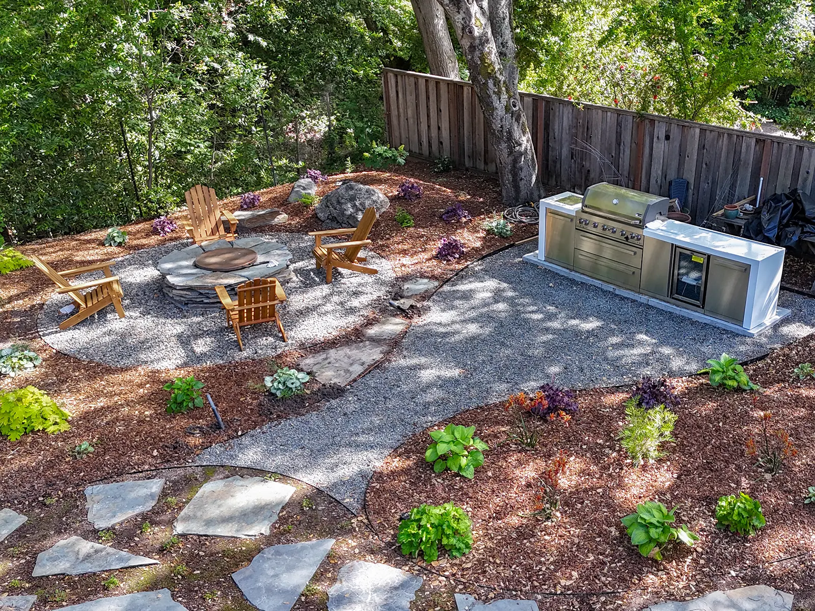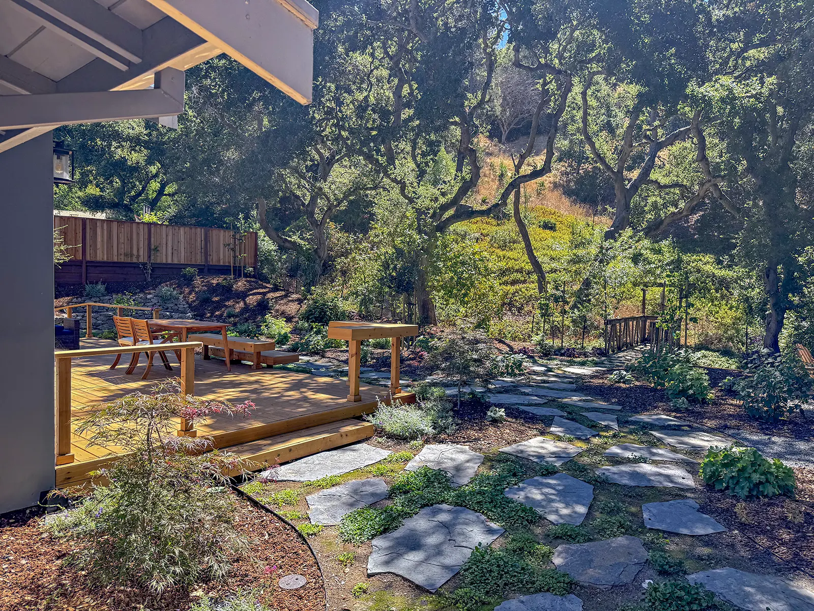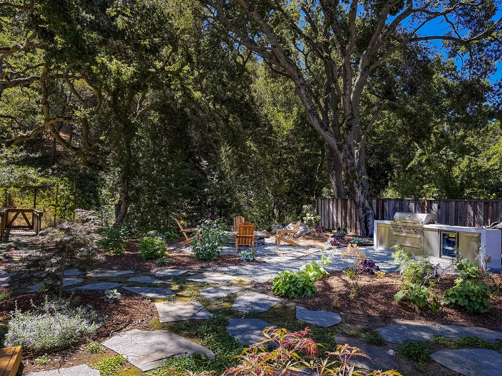 The custom flagstone fire pit and fully equipped outdoor kitchen provide ideal spots for relaxation and entertainment year-round. Meandering flagstone pathways, adorned with ground cover, weave through the landscape, leading to a striking Napa basalt retaining wall that incorporates a veggie garden.