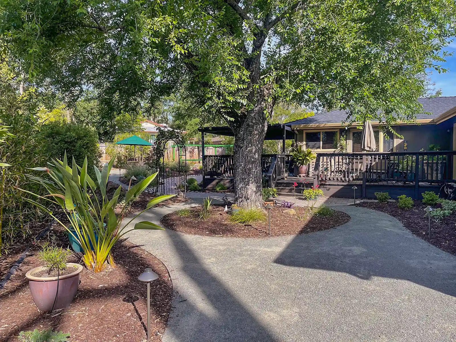 The flatwork showcases the deliberate use of adding flagstone in areas meant for functionality, and decomposed granite to create walkways and sitting areas. Beyond its functional role in delineating garden areas and providing a clean, uniform look to the landscape, mulch also helps retain moisture in the soil, promoting healthy plant growth. Plus, the lighting features when seen at night, illuminate a welcoming space in the evenings.